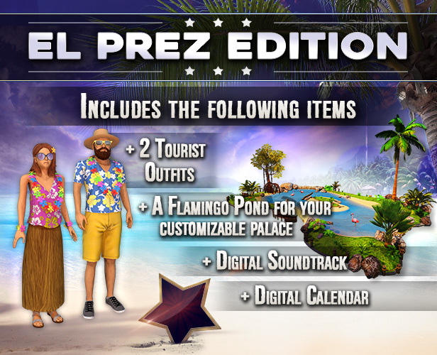 - The exclusive palace design contains the captivating flamingo pond, something every dictator craves to impress his neighbouring states and a tourist costume for El Prez to enjoy those warm caribbean nights adequately. You can also treat your ears to the digital soundtrack, featuring the game's unique and catchy musical score as well as a digital calendar for your dictatorial plans throughout the year.